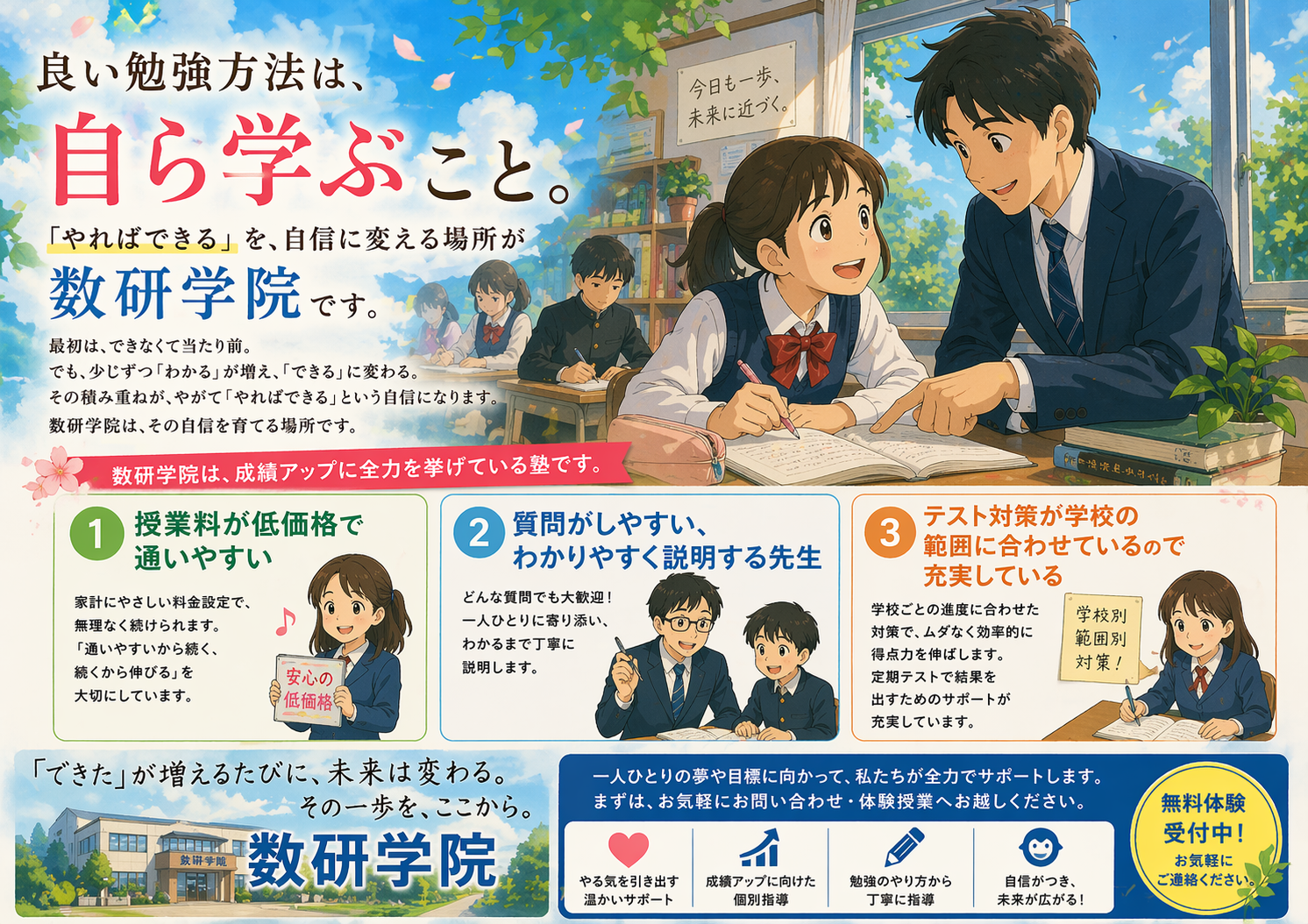 1学期の成績を上げたいなら、数研の個別指導へ