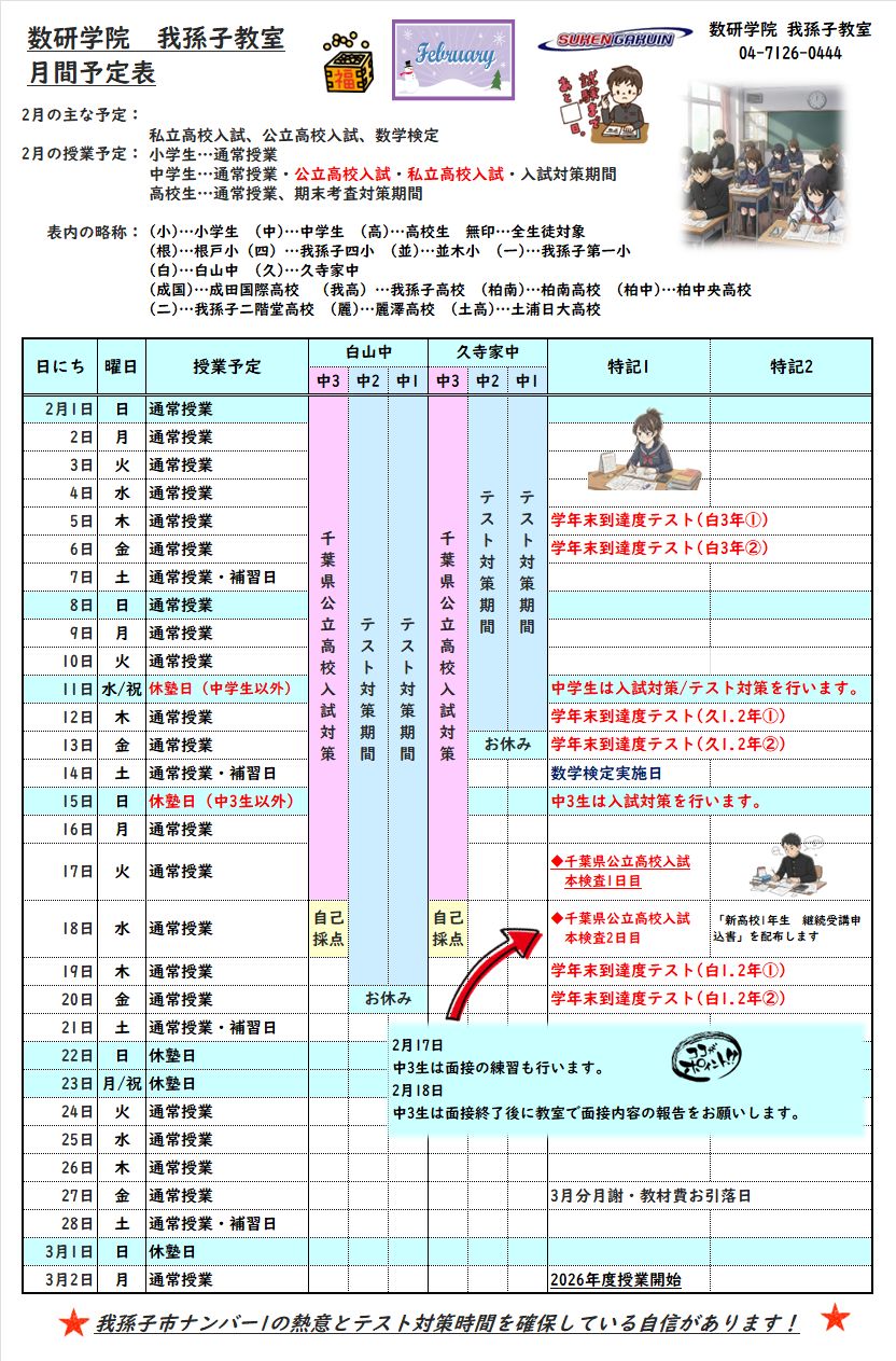 2月の詳しい授業日程や試験対策内容につきましては、