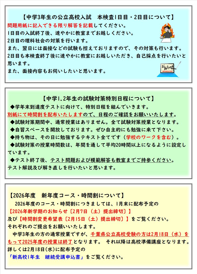 中学3年生は、千葉県公立高校入試(本検査)に向けた最終対策期間となり、