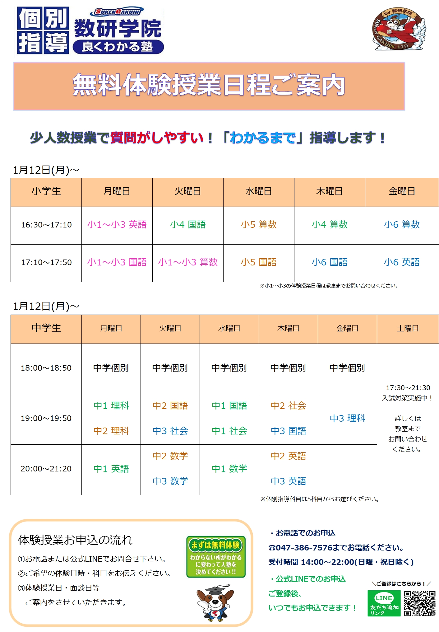 | 松戸第四 | 月曜日 20:00-21:20 数学 水曜日 19:00-19:50 国語 20:00-21:20 数学 |