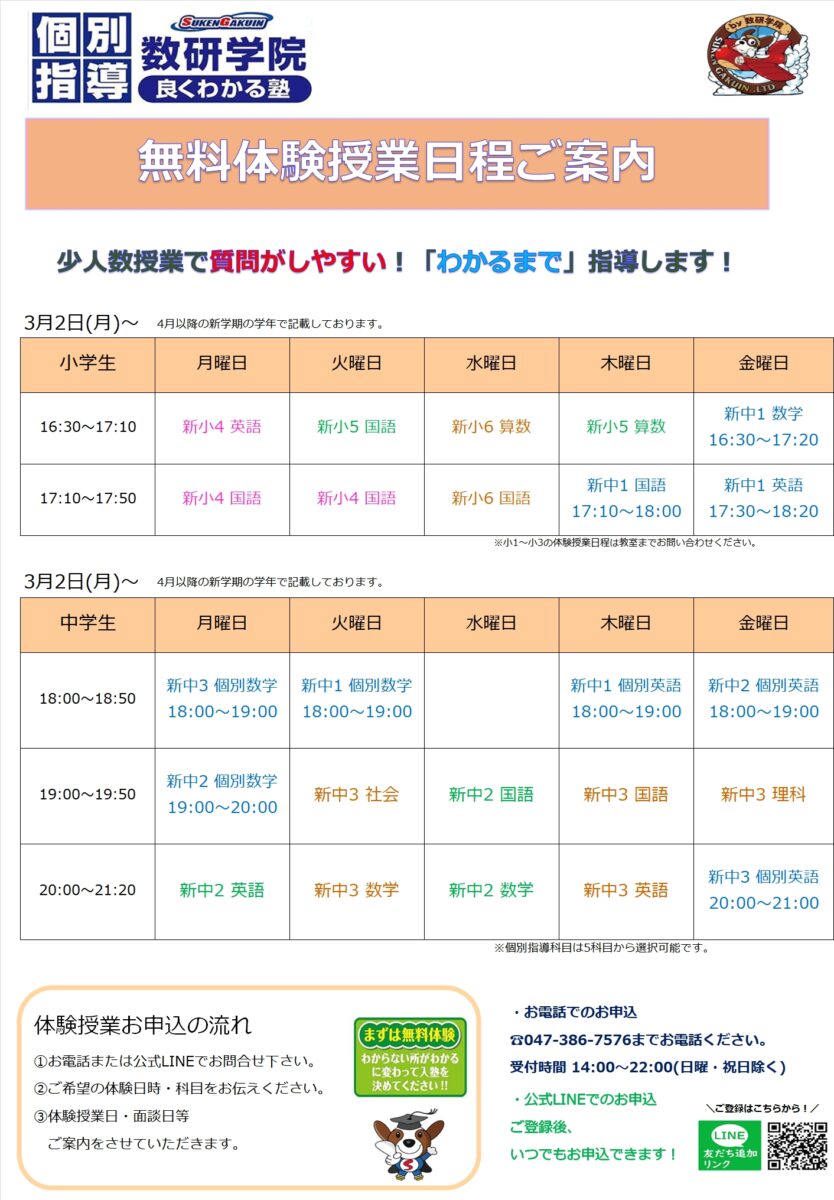 五香教室では春の無料体験授業を実施しています♪